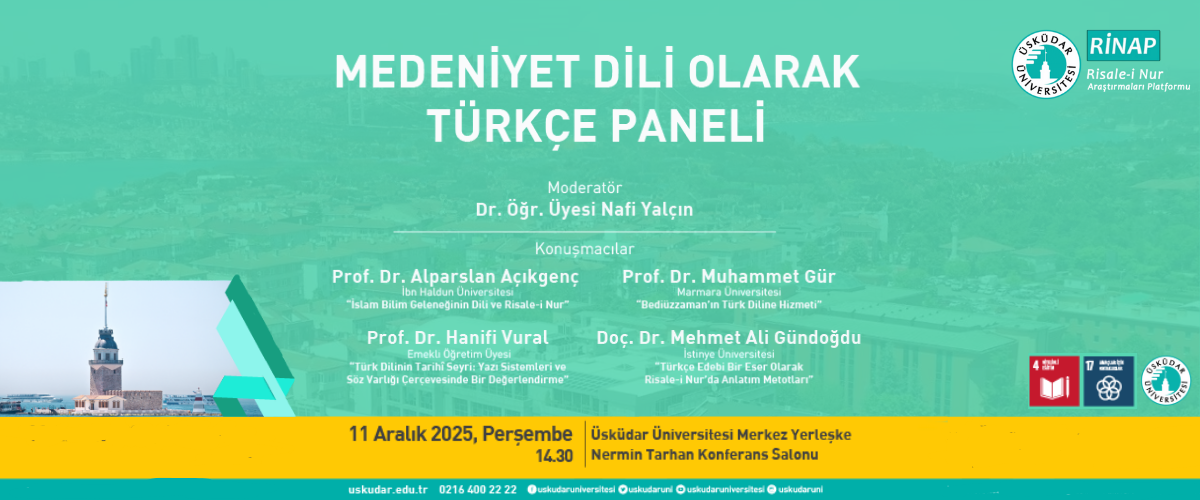 Üsküdar Üniversitesi RİNAP tarafından 11 Aralık 2025 Perşembe günü saat 14.30’da Üsküdar Üniversitesi Merkez Yerleşke Nermin Tarhan Konferans Salonu’nda gerçekleştirilecek bu panelde, Dr. Öğr. Üyesi Nafi Yalçın moderatörlüğünde; Prof. Dr. Alparslan Açıkgenç, Prof. Dr. Muhammet Gür, Prof. Dr. Hanifi Vural ve Doç. Dr. Mehmet Ali Gündoğdu eşliğinde “Medeniyet Dili Olarak Türkçe” konusu üzerine kapsamlı değerlendirme ve paylaşım yapılacaktır.