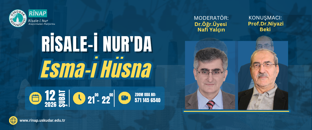 Üsküdar Üniversitesi RİNAP tarafından 12 Şubat 2026 Perşembe günü saat 21.00-22.00 arasında çevrim içi olarak gerçekleştirilecek bu oturumda, Dr. Öğr. Üyesi Nafi Yalçın ve Prof. Dr. Niyazi Beki eşiliğinde ''Risale-i Nur'da Esma-i Hüsna'' konusu üzerine değerlendirme ve paylaşım yapılacaktır.