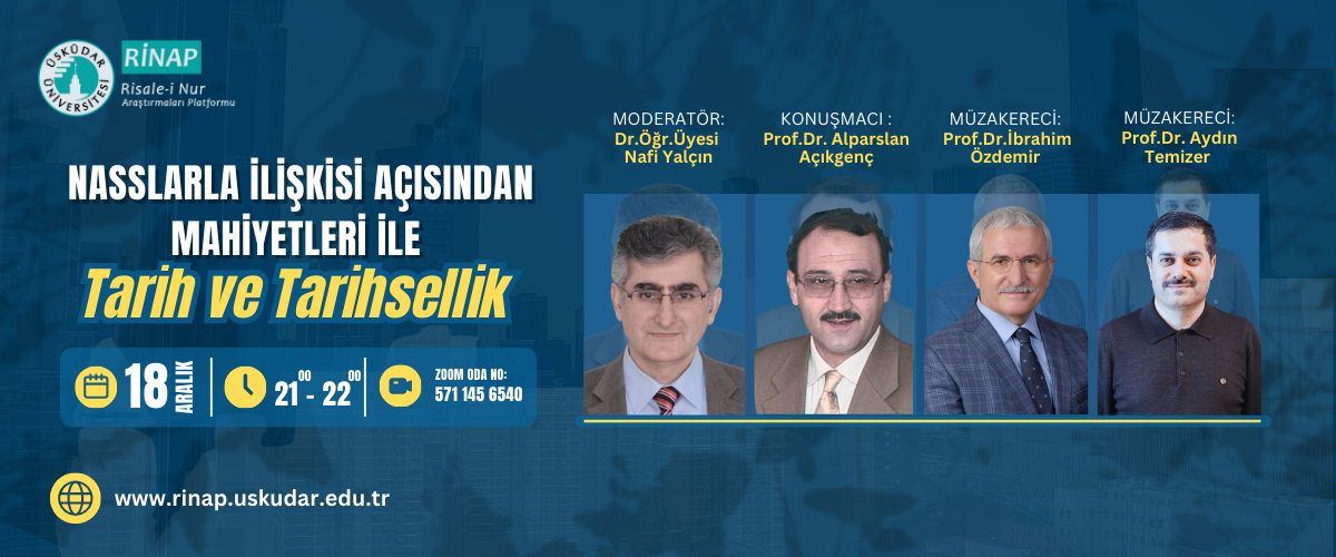 Üsküdar Üniversitesi RİNAP tarafından 18 Aralık Çarşamba günü saat 21.00-22.00 arasında çevrim içi olarak gerçekleştirilecek bu oturumda, Dr. Öğr. Üyesi Nafi Yalçın, Prof. Dr. Alparslan Açıkgenç, Prof. Dr. İbrahim Özdemir ve Prof. Dr. Aydın Temizer eşliğinde “Nasslarla İlişkisi Açısından Mahiyetleri ile Tarih ve Tarihsellik” konusu üzerine değerlendirme ve paylaşım yapılacaktır.